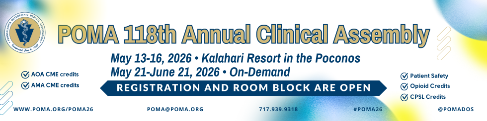 POMA - YOUR HOME FOR OSTEOPATHIC MEDICINEPOMA’s mission is to promote the distinctive philosophy and practice of osteopathic medicine for our patients, our members, and the communities we serve. The Pennsylvania Osteopathic Medical Association (POMA) proudly represents its professional osteopathic family since 1903. Our family includes more than 12,300 osteopathic physicians, residents & interns and 2,600 osteopathic students. Through the promotion of public health and encouraging scientific research we aim to continue to advance the science and art of osteopathic medicine. As the osteopathic medical field continues to grow, we remain your home for everything osteopathic medicine.