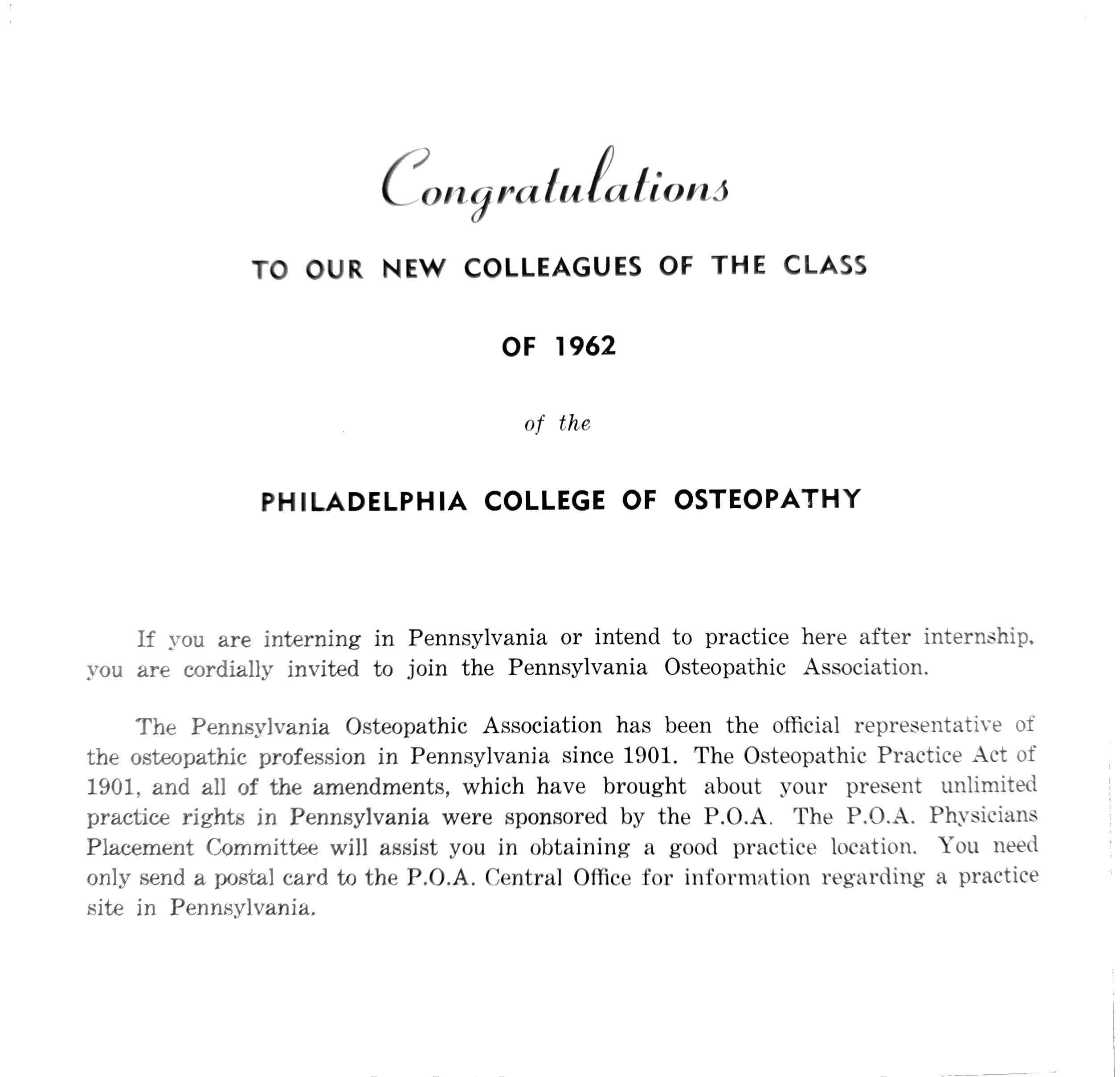 Even in 1962, membership was a key discussion at the Pennsylvania Osteopathic Association, as POMA was known then. This ad congratulates the recent graduates of the Philadelphia College of Osteopathy and invites them to join the POA. Now in 2026, we are still focusing on membership in an era where many organizations are suffering the same fate.